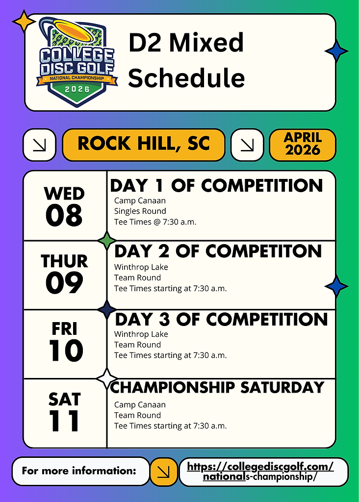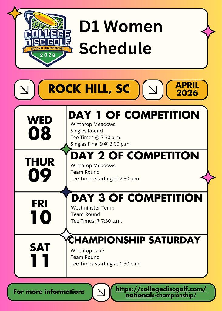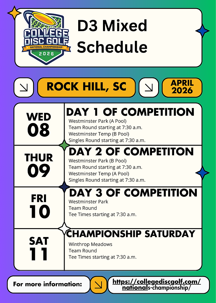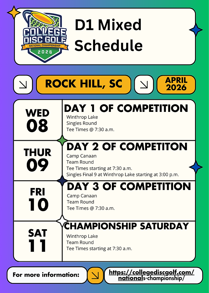 We have some important National Championship updates and reminders in this Newsletter for you. We are three weeks away from day 1 of competition and we cannot wait to see our athletes, coaches and College Disc Golf fans out in Rock Hill, SC for one of the first PDGA Majors of the year April 8 - 11.
